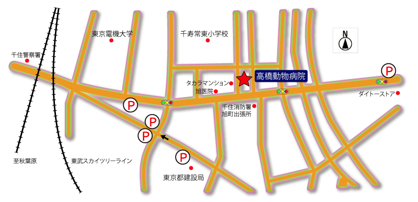 ・千住東一丁目交差点千住宮元町方面からの場合は「左折」、堀切方面からの場合は「右折」します。(この交差点はT字路です)